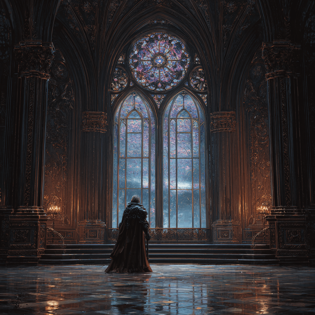 An ancient, melancholic vampire lord gazing out a grand stained-glass window of a dark academia university, a storm brewing outside, oil painting with subtle engraving textures, fantasy, mysterious, rich jewel tones, epic lighting, intricate architecture, 8k