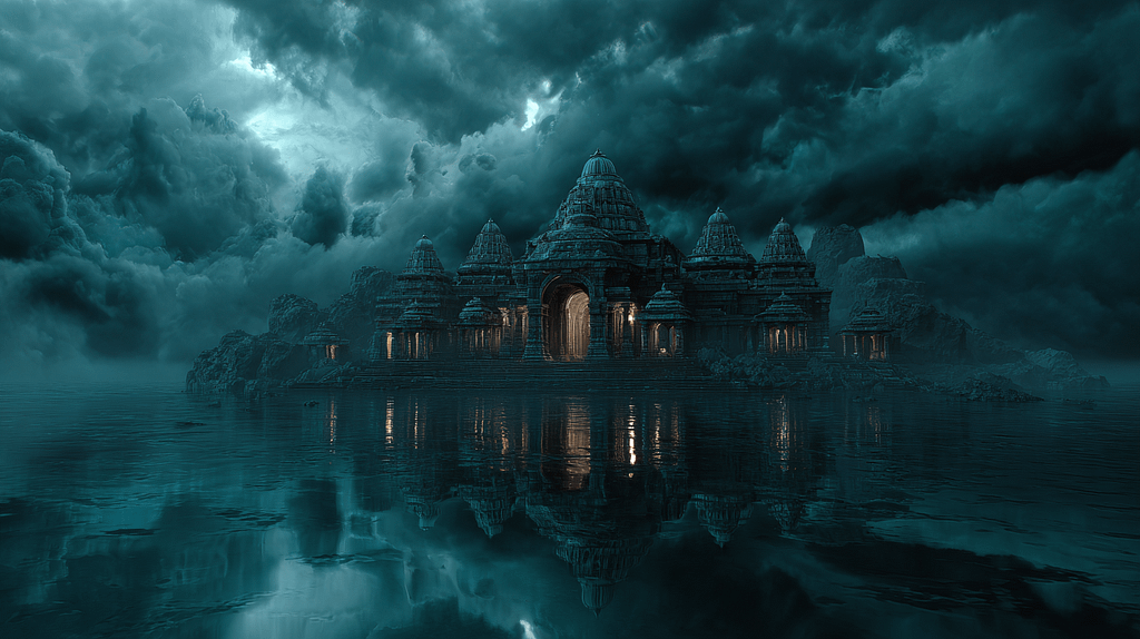 cinematic photo of a vast, ancient fantasy temple partially submerged in crystal-clear, still water, reflecting an eerie, otherworldly sky, empty, silent, epic, detailed, mystical, intricate, epic lighting, 8k, photorealistic –ar 16:9