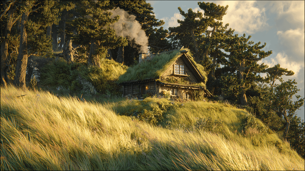 photorealistic cinematic wide shot of a charming Ghibli-style cottage nestled on a verdant hillside, smoke gently curling from its chimney, surrounded by ancient, moss-covered trees and a field of tall grass swaying in a soft breeze, bathed in the golden hour’s gentle, diffused light, intricate details, epic, 8k –ar 16:9