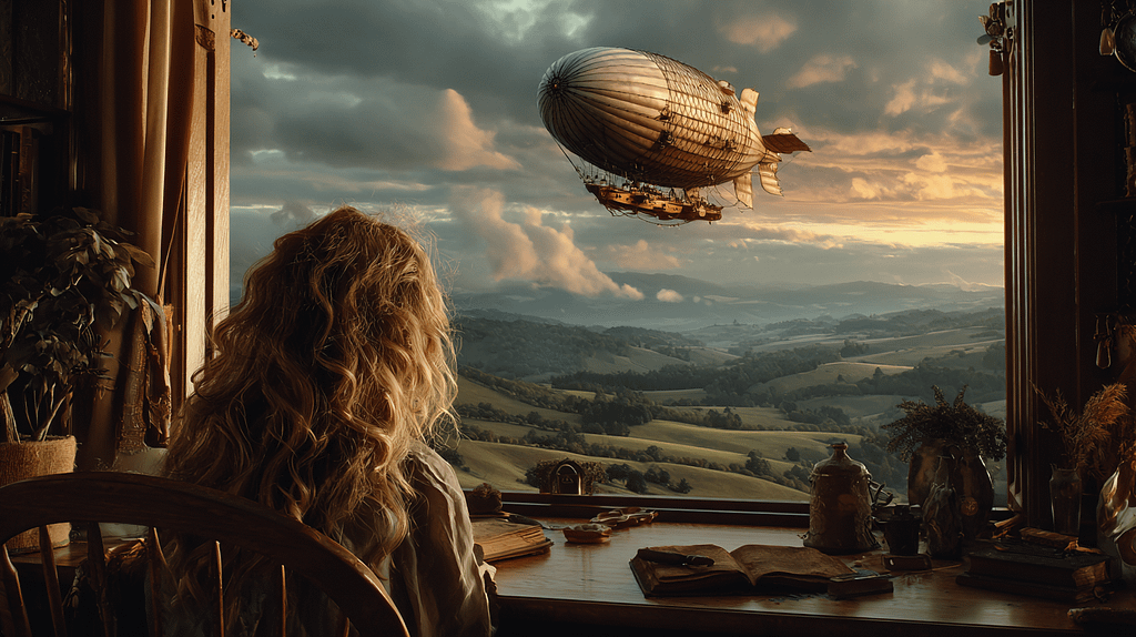 cinematic photo of a young girl gazing out a window at a fantastical, photorealistic airship gracefully floating above a pastoral valley, gentle evening glow painting the sky, a warm, cozy room interior reflected in the glass, radiating emotional depth, detailed, intricate, epic lighting, 8k, photorealistic –ar 16:9